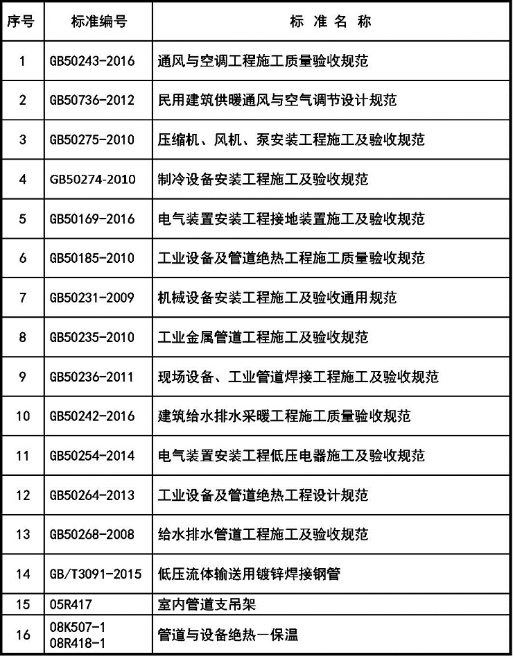 中央空調(diào)工程安裝除了滿足施工設(shè)計(jì)文件、圖紙的規(guī)定與要求外,還必須遵行下列相關(guān)標(biāo)準(zhǔn)和規(guī)范:
